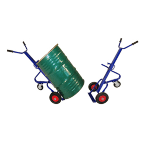 Тележка для транспортировки металлических бочек. Установлено опорное третье колесо диаметром 160 мм. Верхний край бочки закрепляется с помощью затвора.
